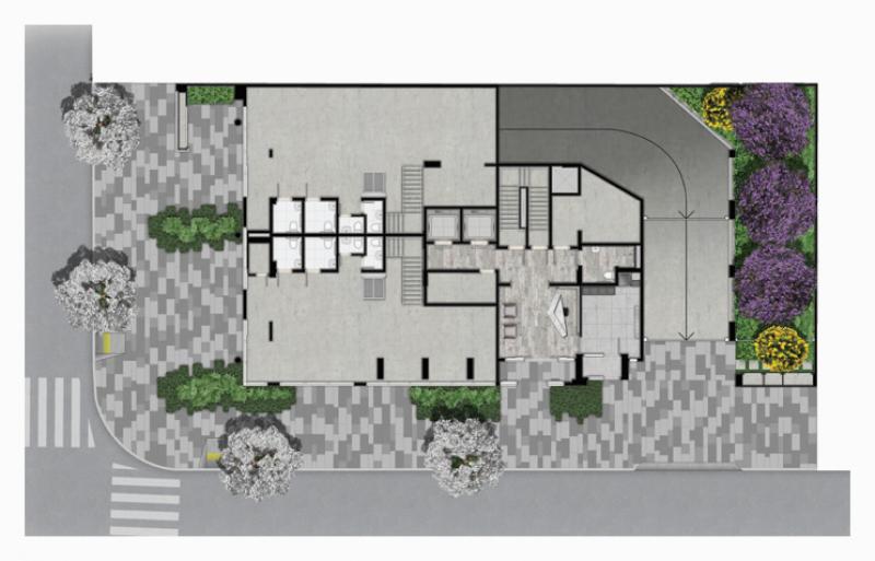 Calçadas amplas com paisagismo integrado que une o empreendimento à cidade