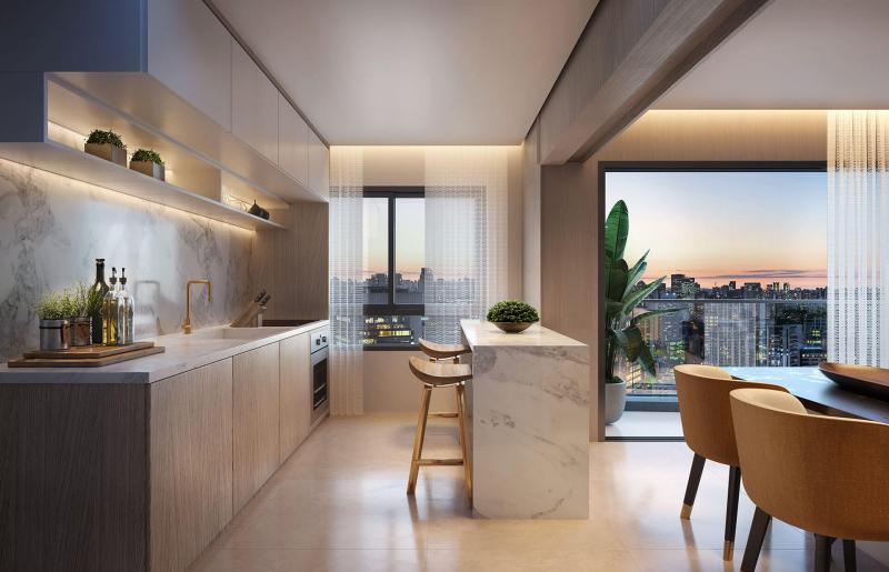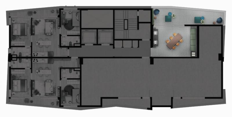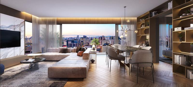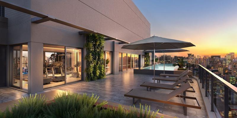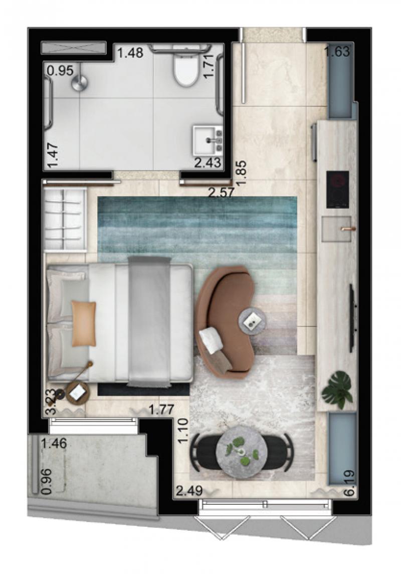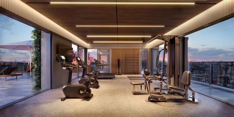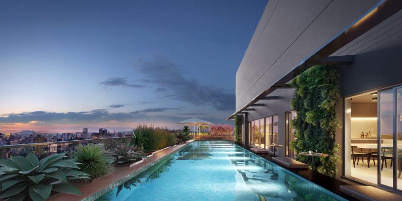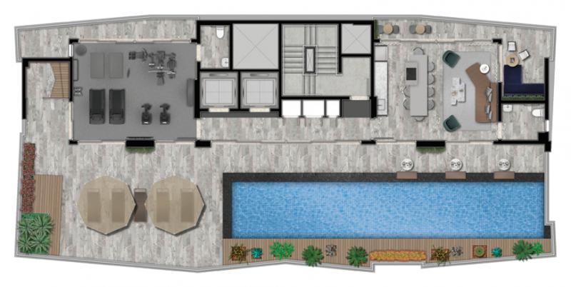 Pavimentos: 19 pavimentos, sendo 3 subsolos, térreo com lojas e acesso ao edifício, mezanino, 2 pavimentos com unidades de serviço de moradia, 10 pavimentos com unidades residenciais, 1 pavimento com lazer e unidades residenciais e 1 pavimento de lazer.