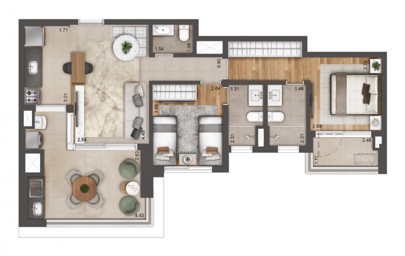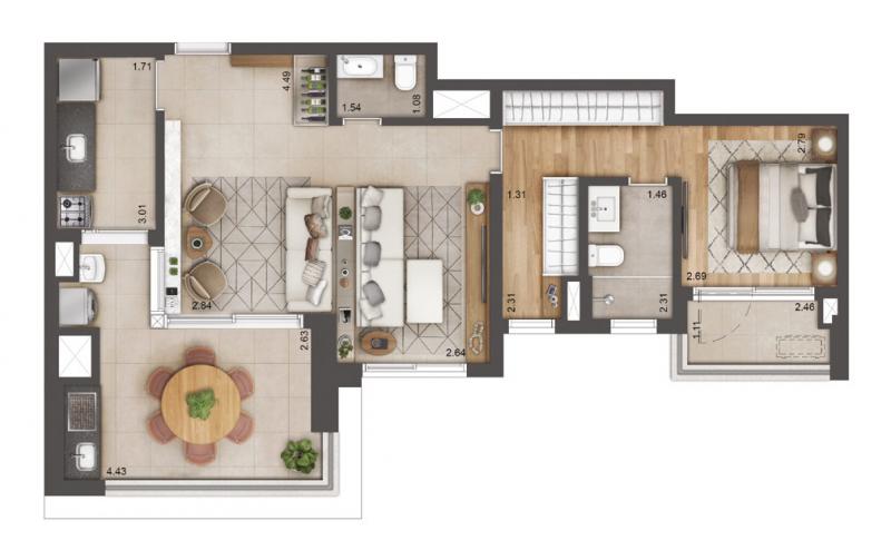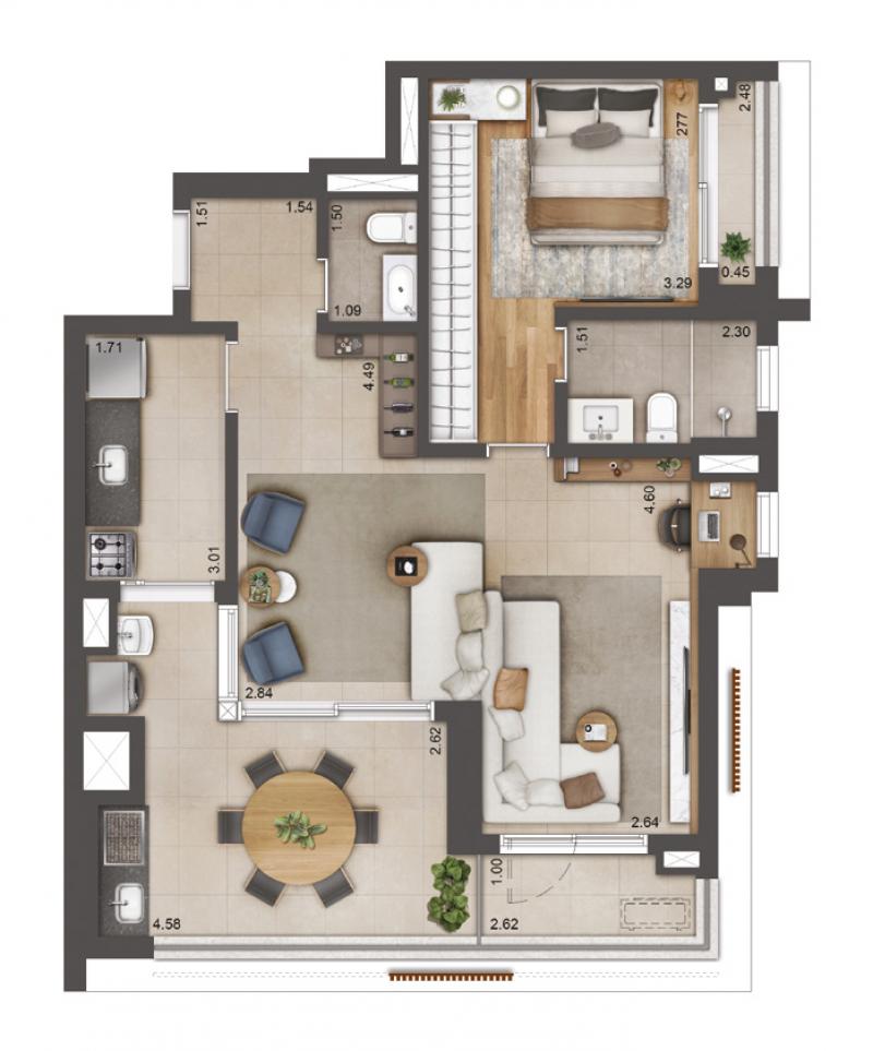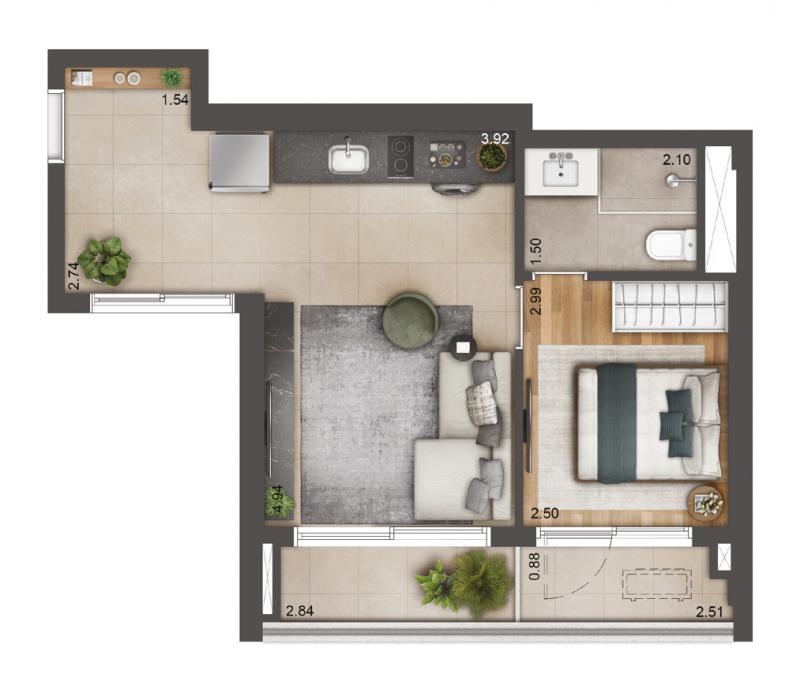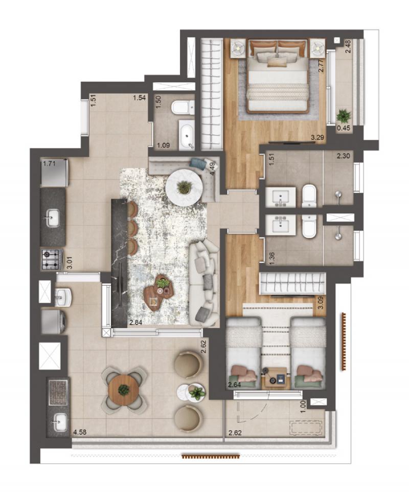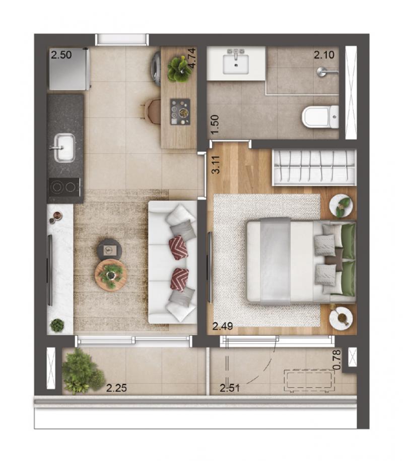 82 m² – 02 Suítes / 01 Vaga de garagem