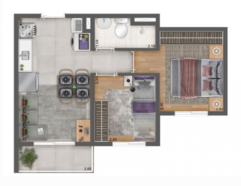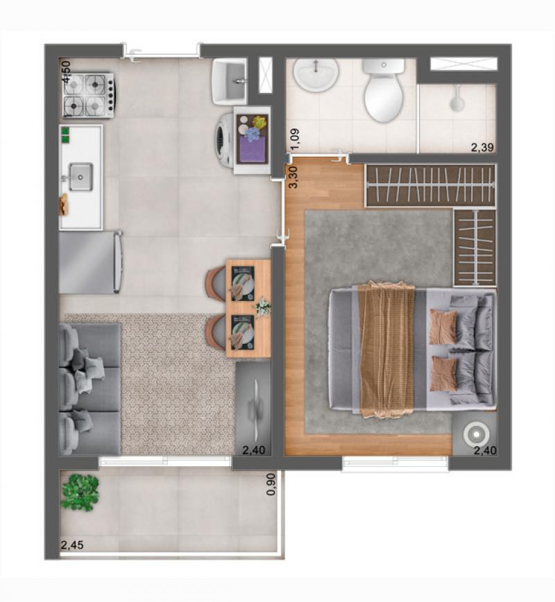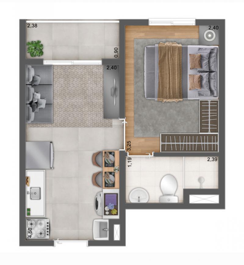 Apartamento de 01 Dormitório: 26,91 m² a 27,36 m²